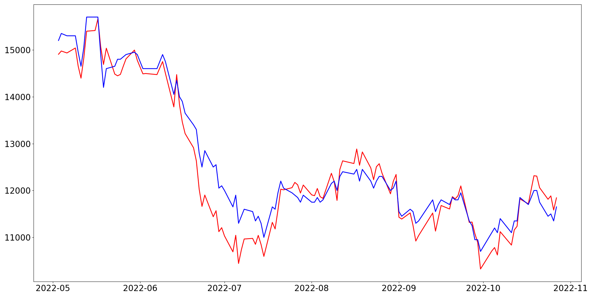 [ - : 실제값(종가) / - : 예측값(종가) ]