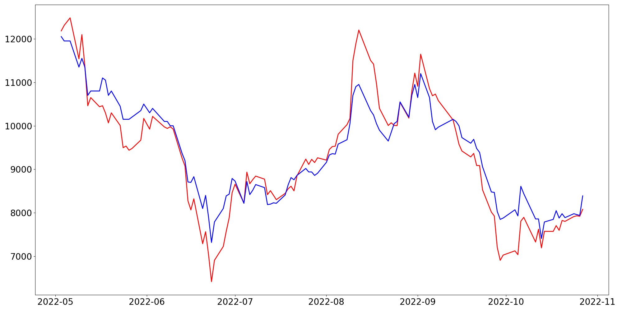 [ - : 실제값(종가) / - : 예측값(종가) ]