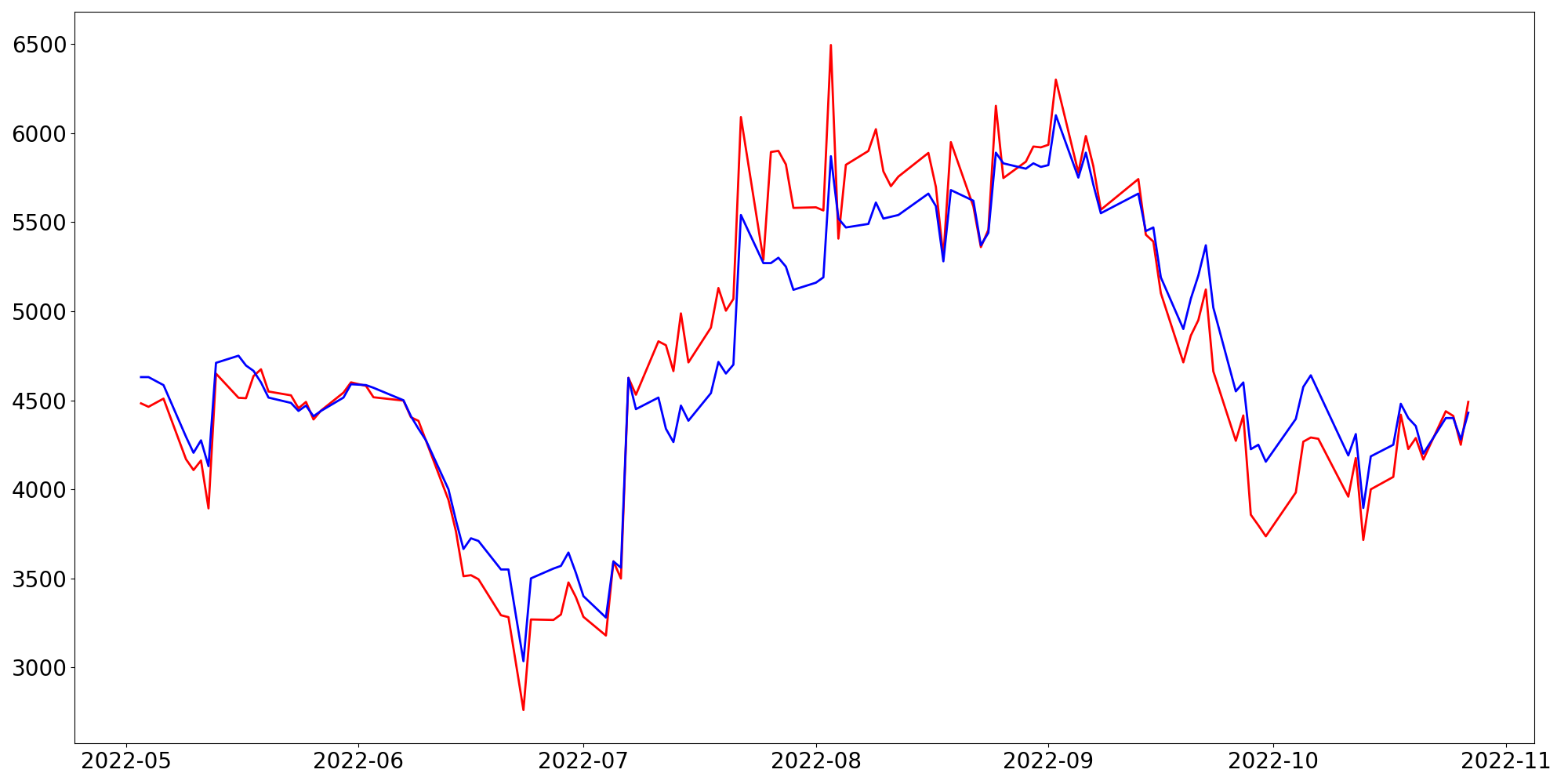 [ - : 실제값(종가) / - : 예측값(종가) ]