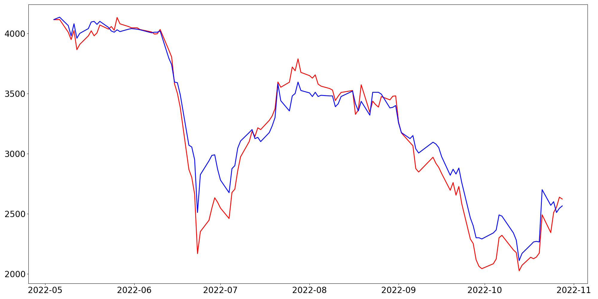 [ - : 실제값(종가) / - : 예측값(종가) ]
