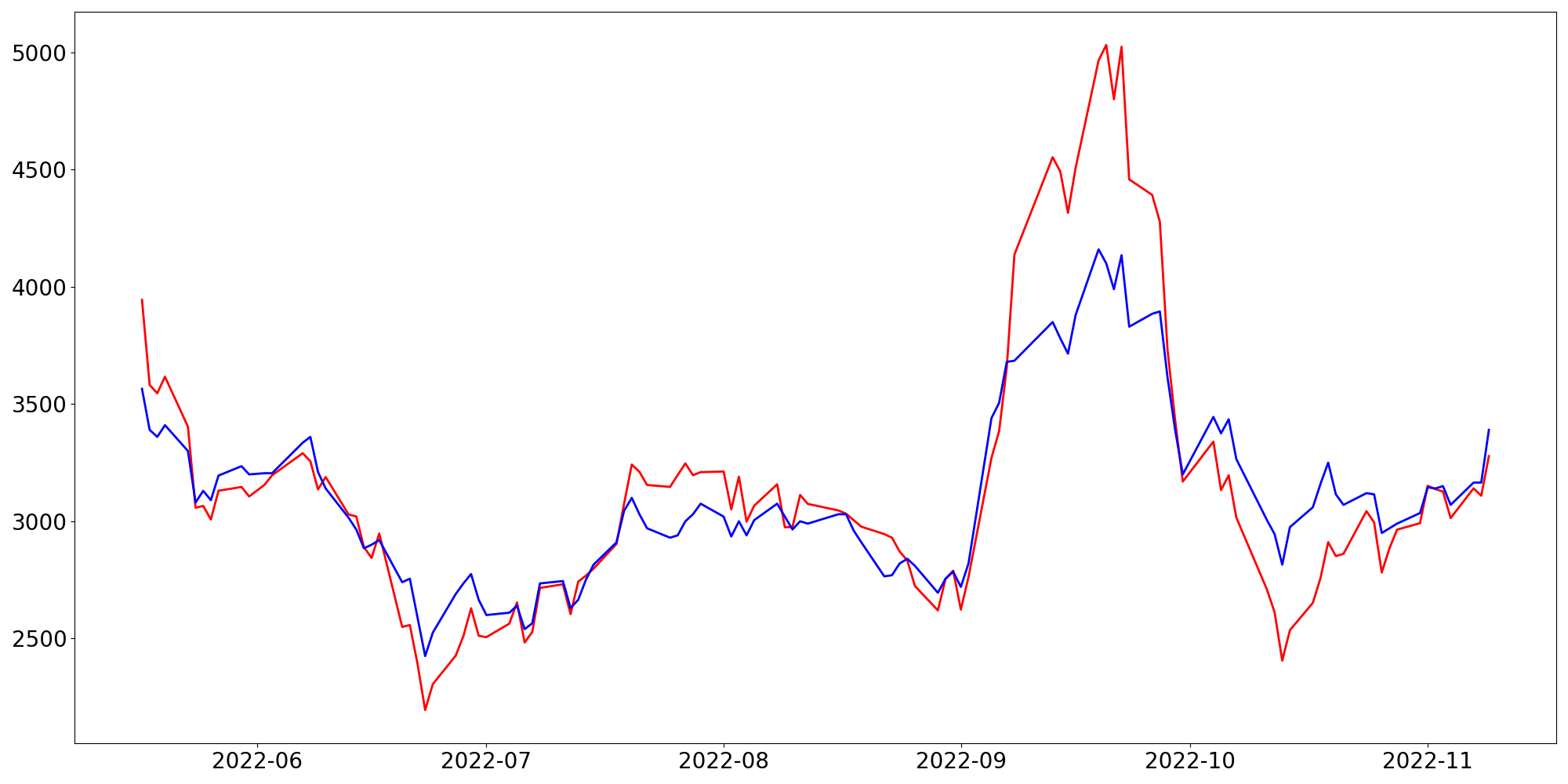 [ - : 실제값(종가) / - : 예측값(종가) ]