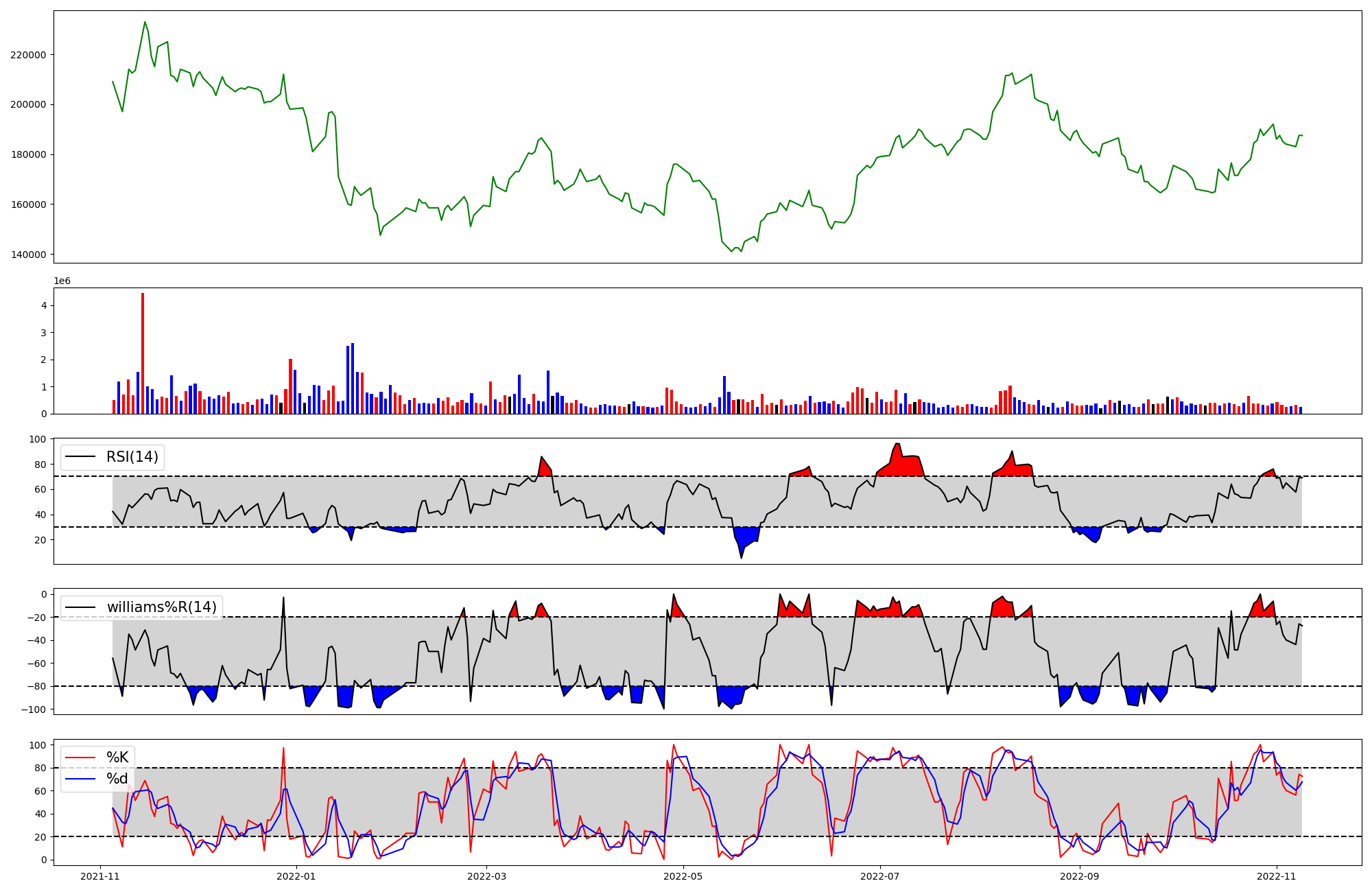 일별 기술적 지표(모멘텀 / 추세 / 시장강도 등)를 활용하여 향후 주가의 움직임을 회귀분석(Regression Analysis)을 통햬 예측해 본 결과입니다.