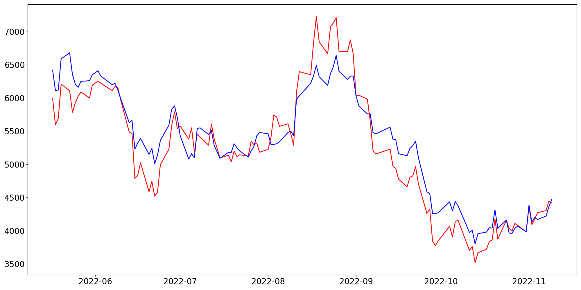 [ - : 실제값(종가) / - : 예측값(종가) ]