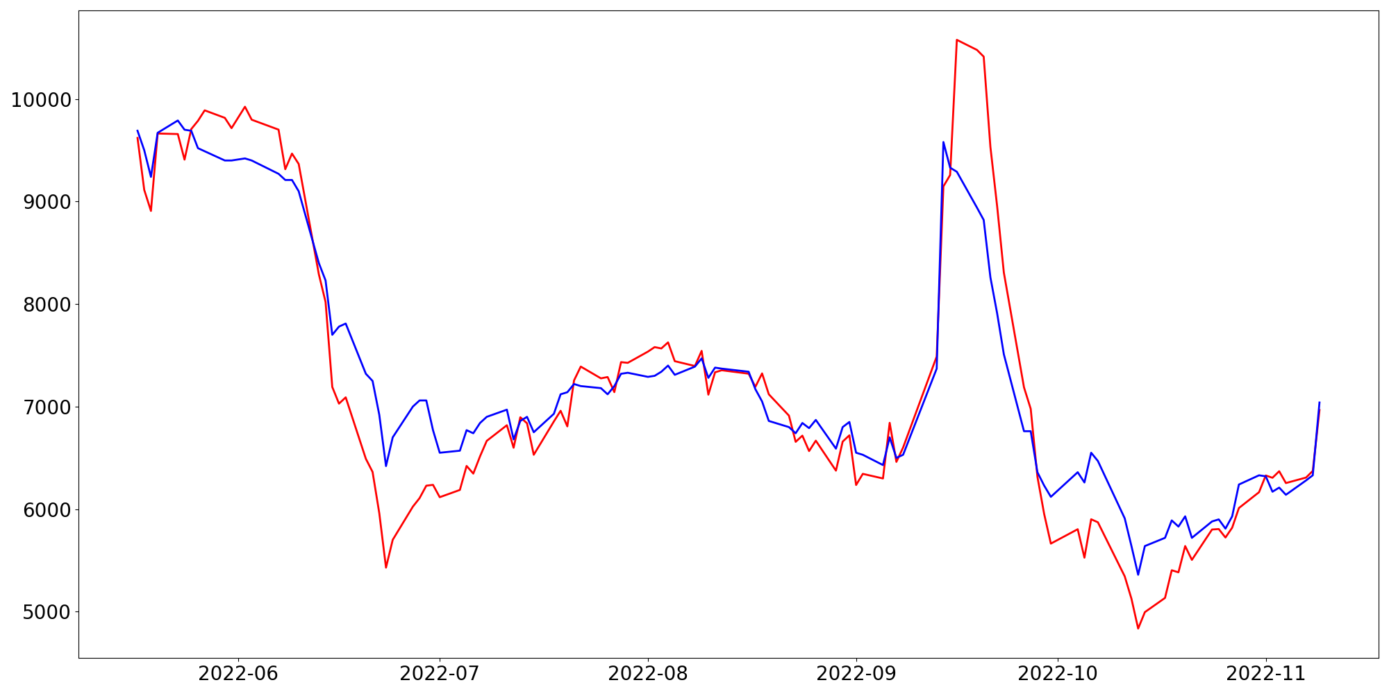 [ - : 실제값(종가) / - : 예측값(종가) ]