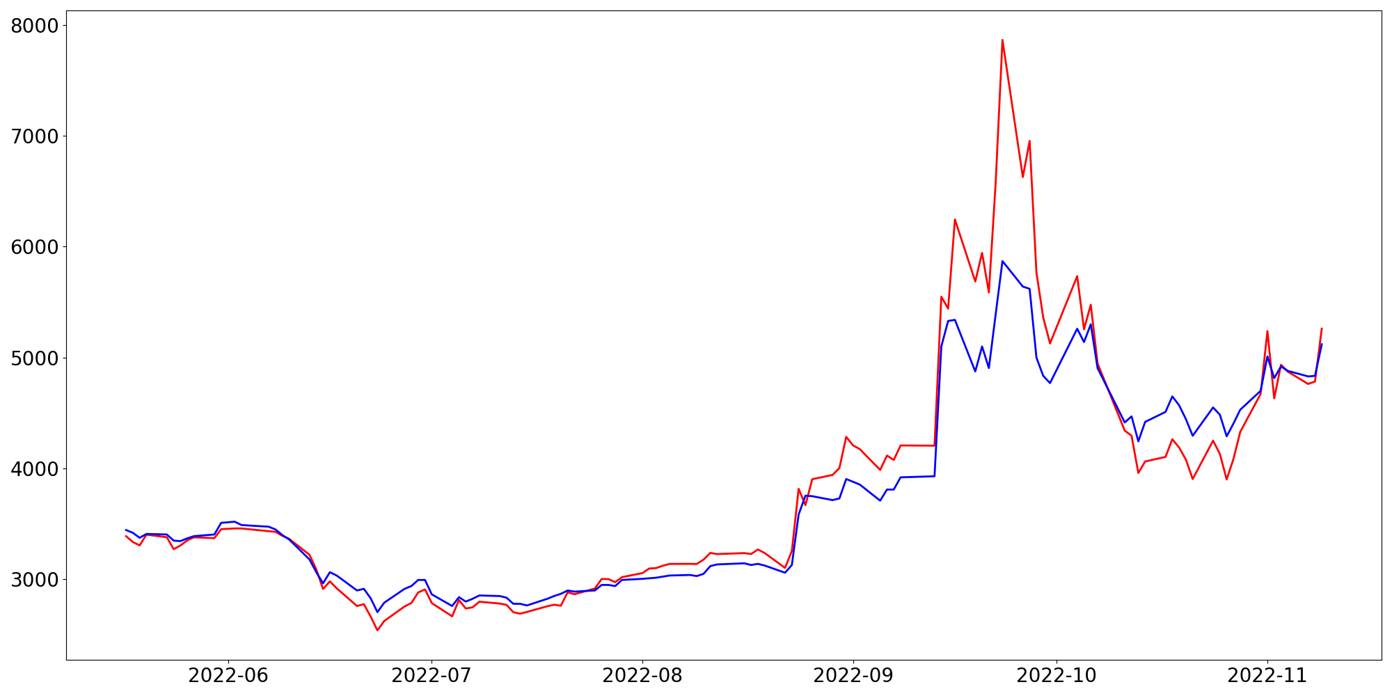 [ - : 실제값(종가) / - : 예측값(종가) ]
