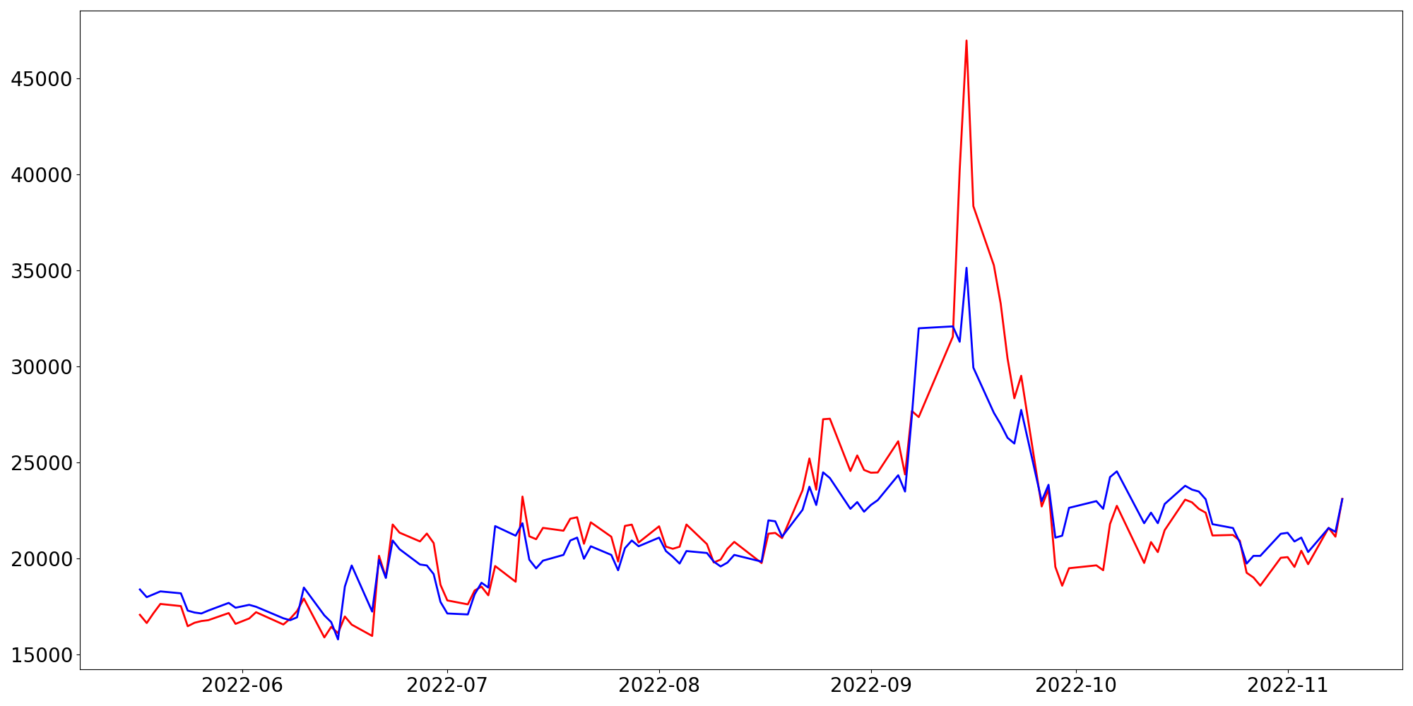[ - : 실제값(종가) / - : 예측값(종가) ]