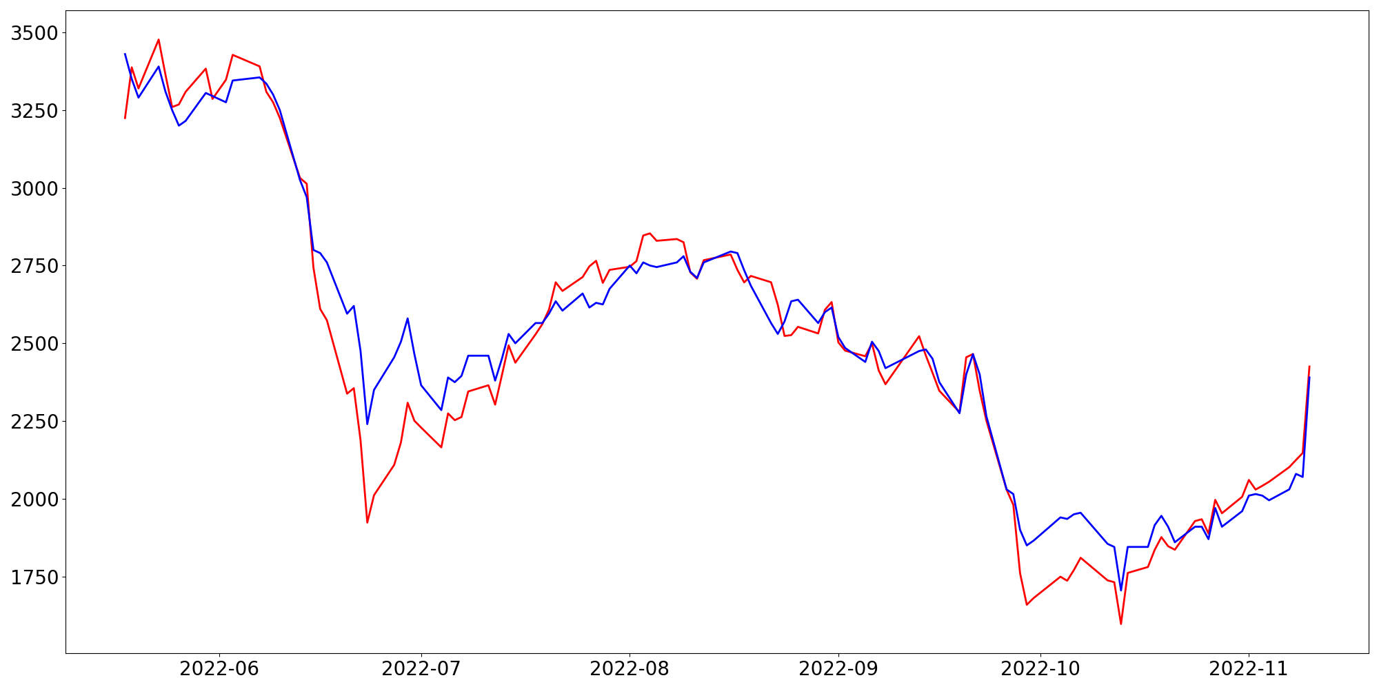 [ - : 실제값(종가) / - : 예측값(종가) ]