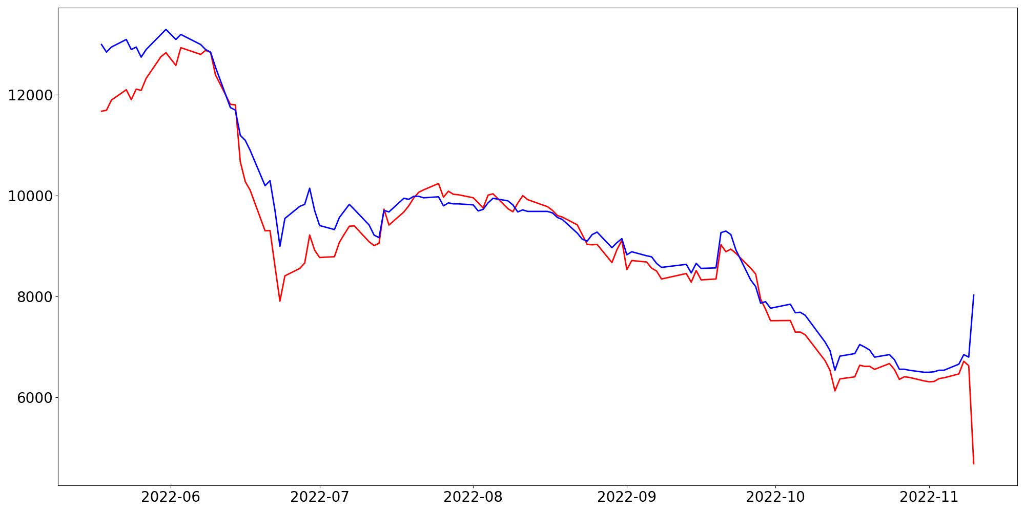 [ - : 실제값(종가) / - : 예측값(종가) ]