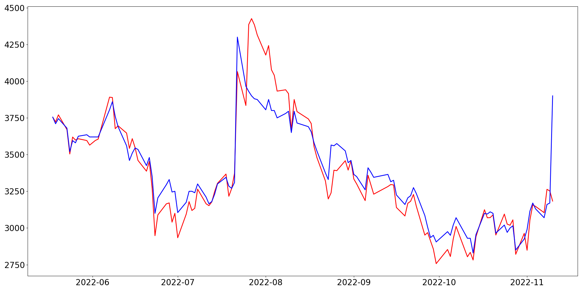 [ - : 실제값(종가) / - : 예측값(종가) ]