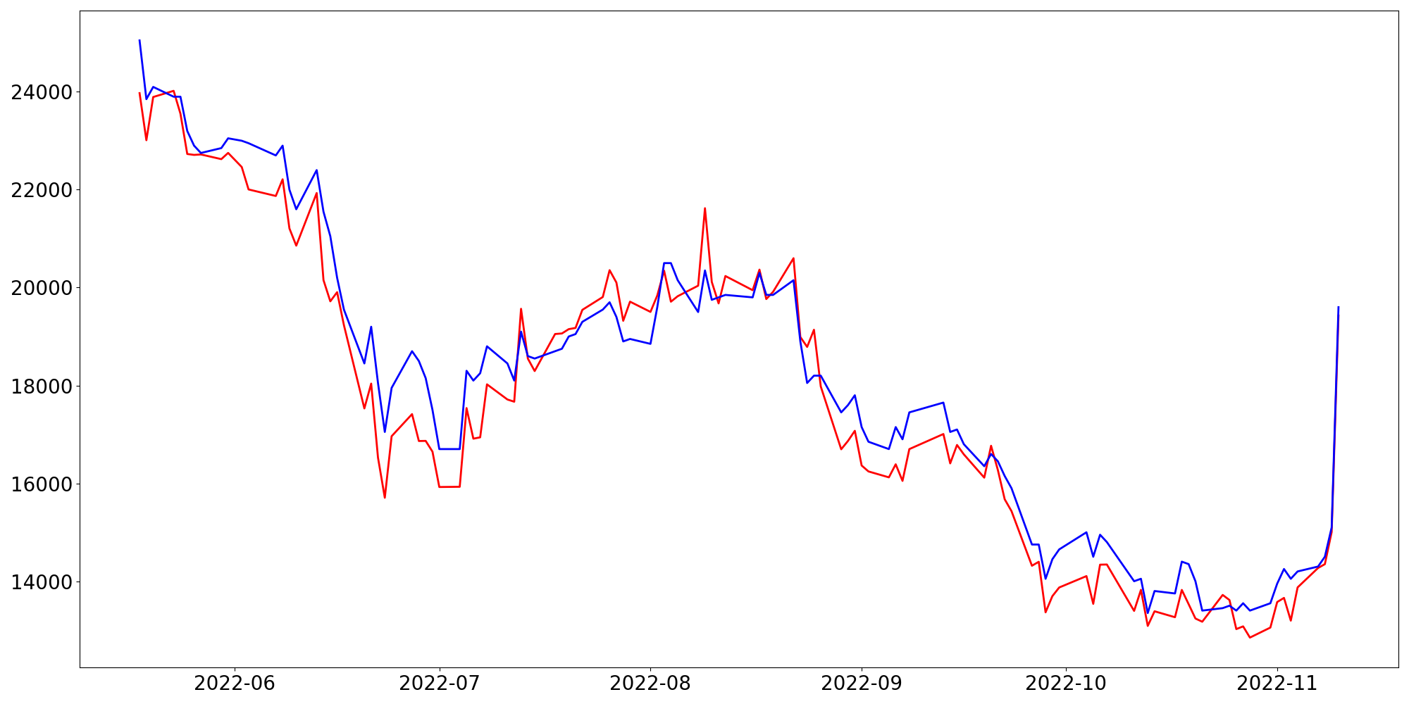 [ - : 실제값(종가) / - : 예측값(종가) ]