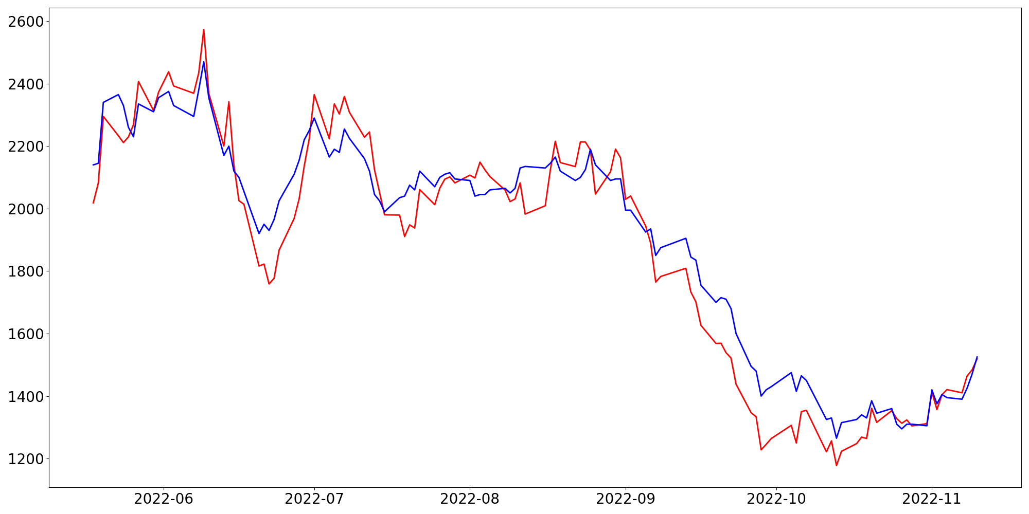 [ - : 실제값(종가) / - : 예측값(종가) ]