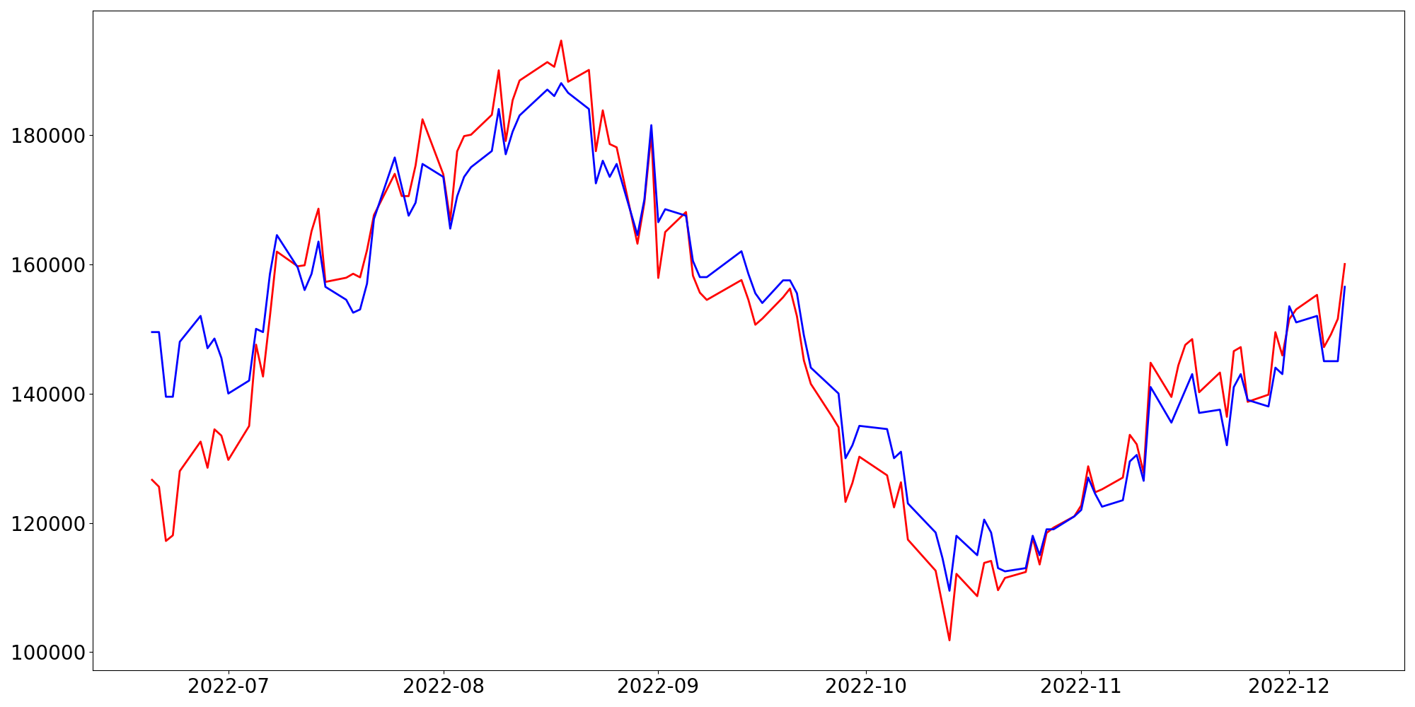 [ - : 실제값(종가) / - : 예측값(종가) ]