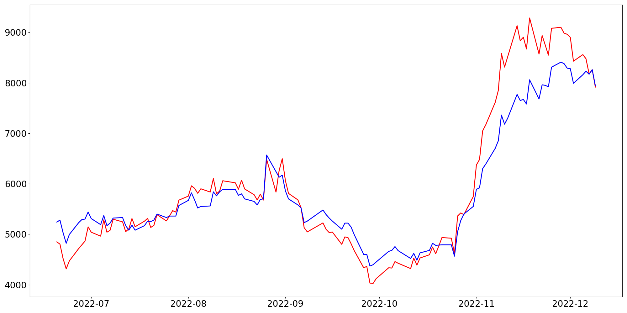 [ - : 실제값(종가) / - : 예측값(종가) ]