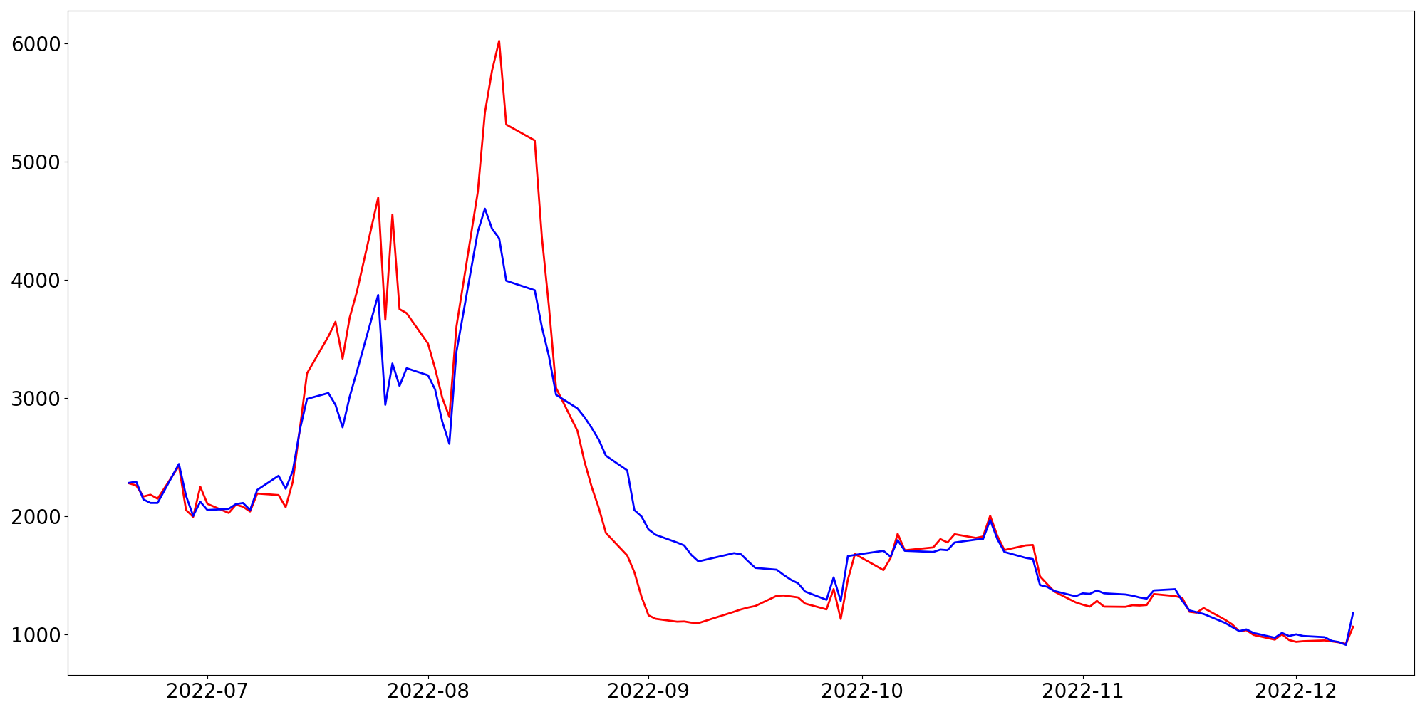 [ - : 실제값(종가) / - : 예측값(종가) ]