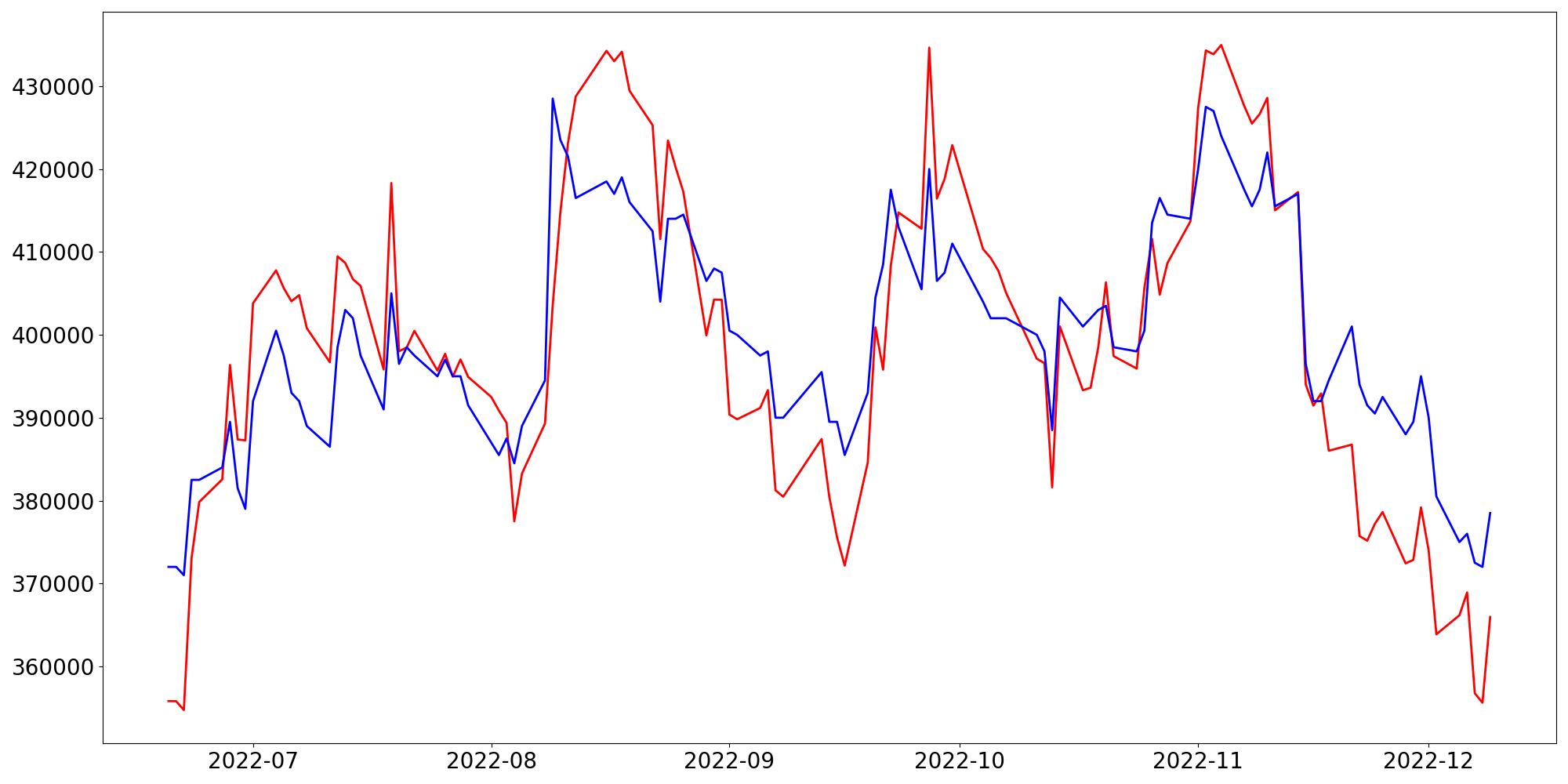[ - : 실제값(종가) / - : 예측값(종가) ]