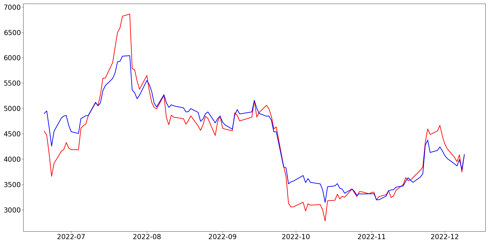 [ - : 실제값(종가) / - : 예측값(종가) ]