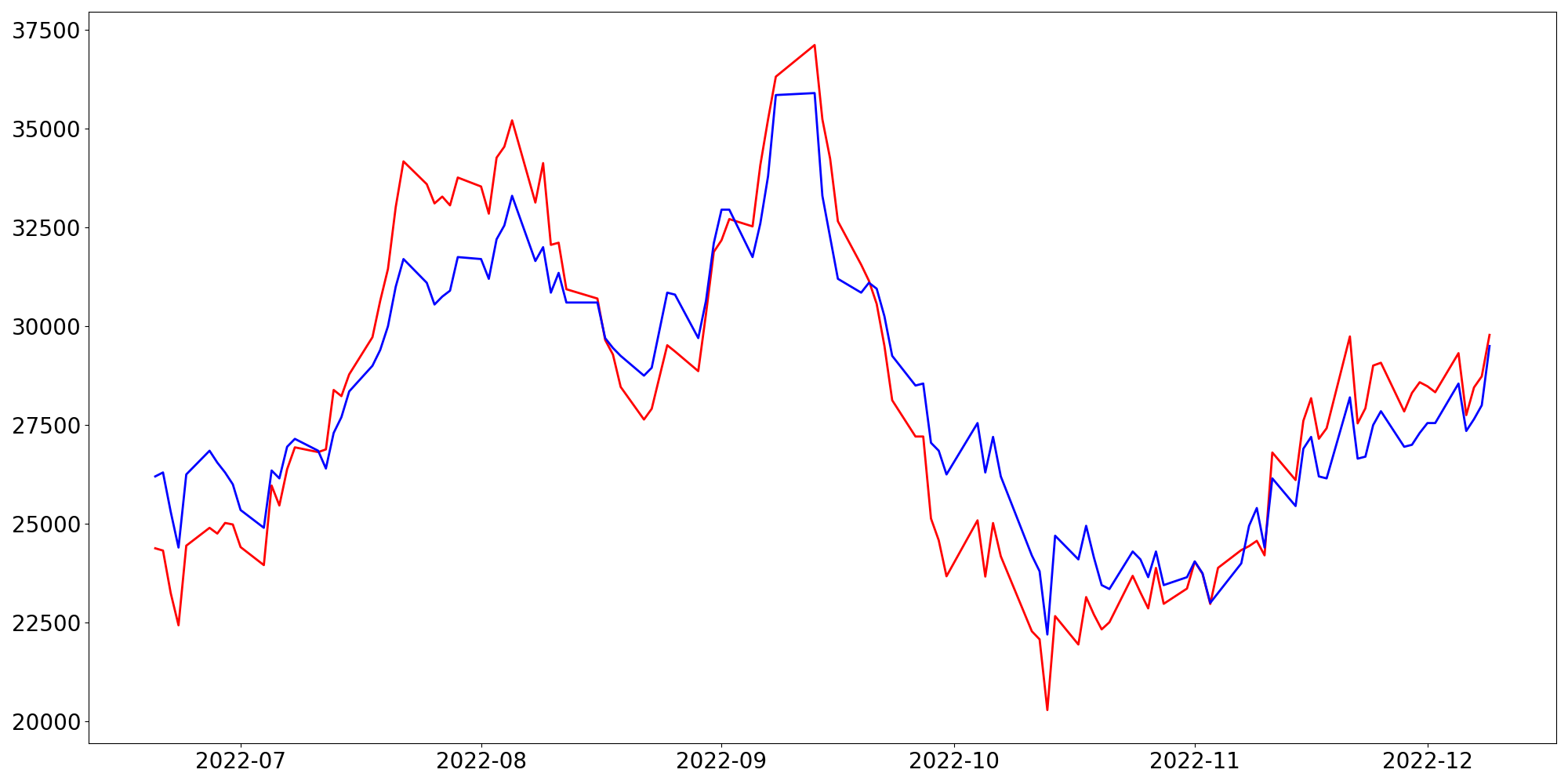 [ - : 실제값(종가) / - : 예측값(종가) ]