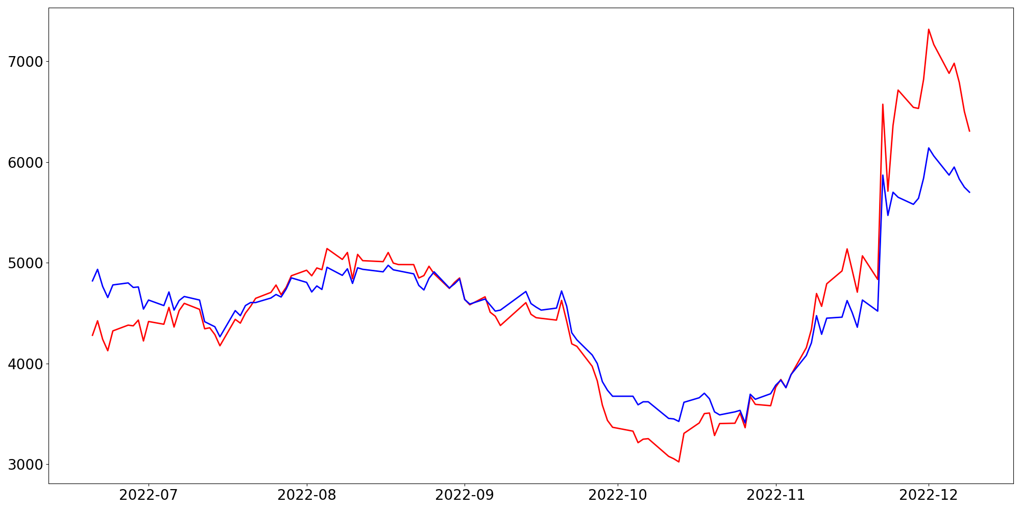[ - : 실제값(종가) / - : 예측값(종가) ]