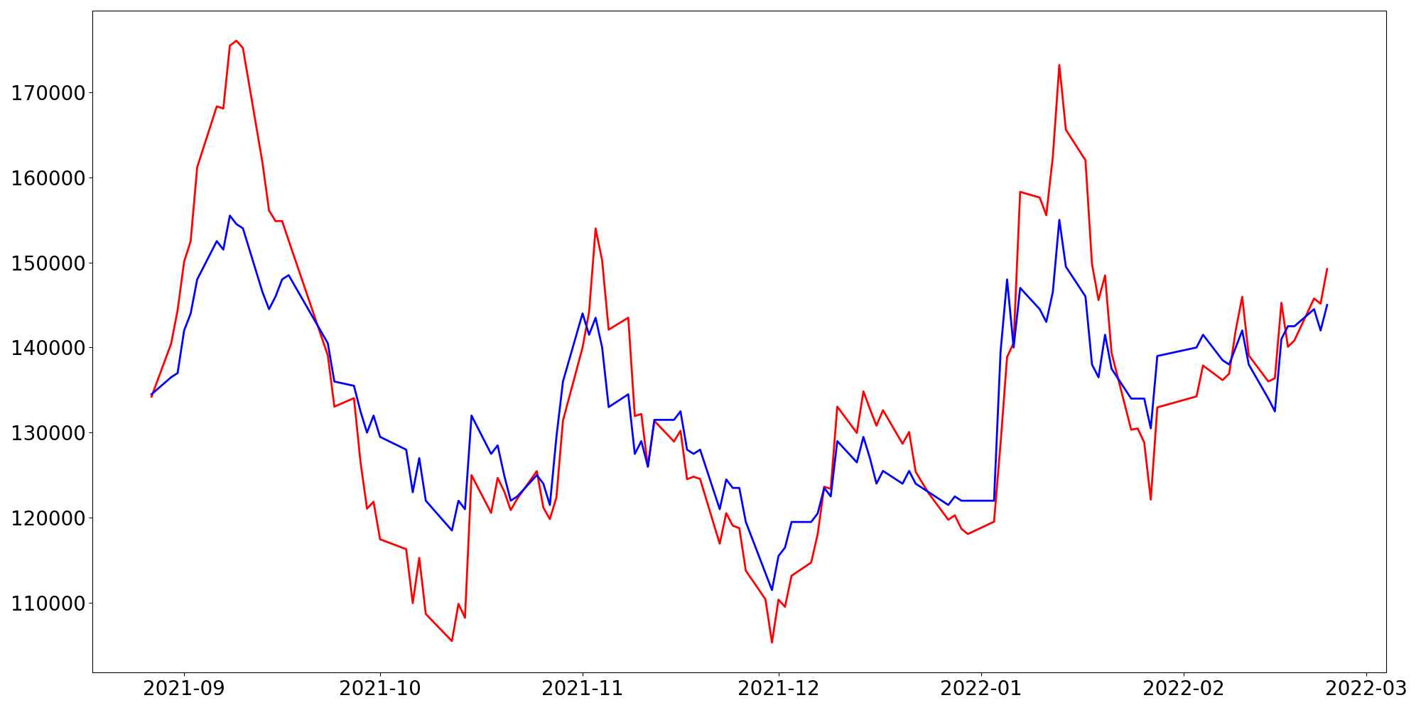 [ - : 실제값(종가) / - : 예측값(종가) ]