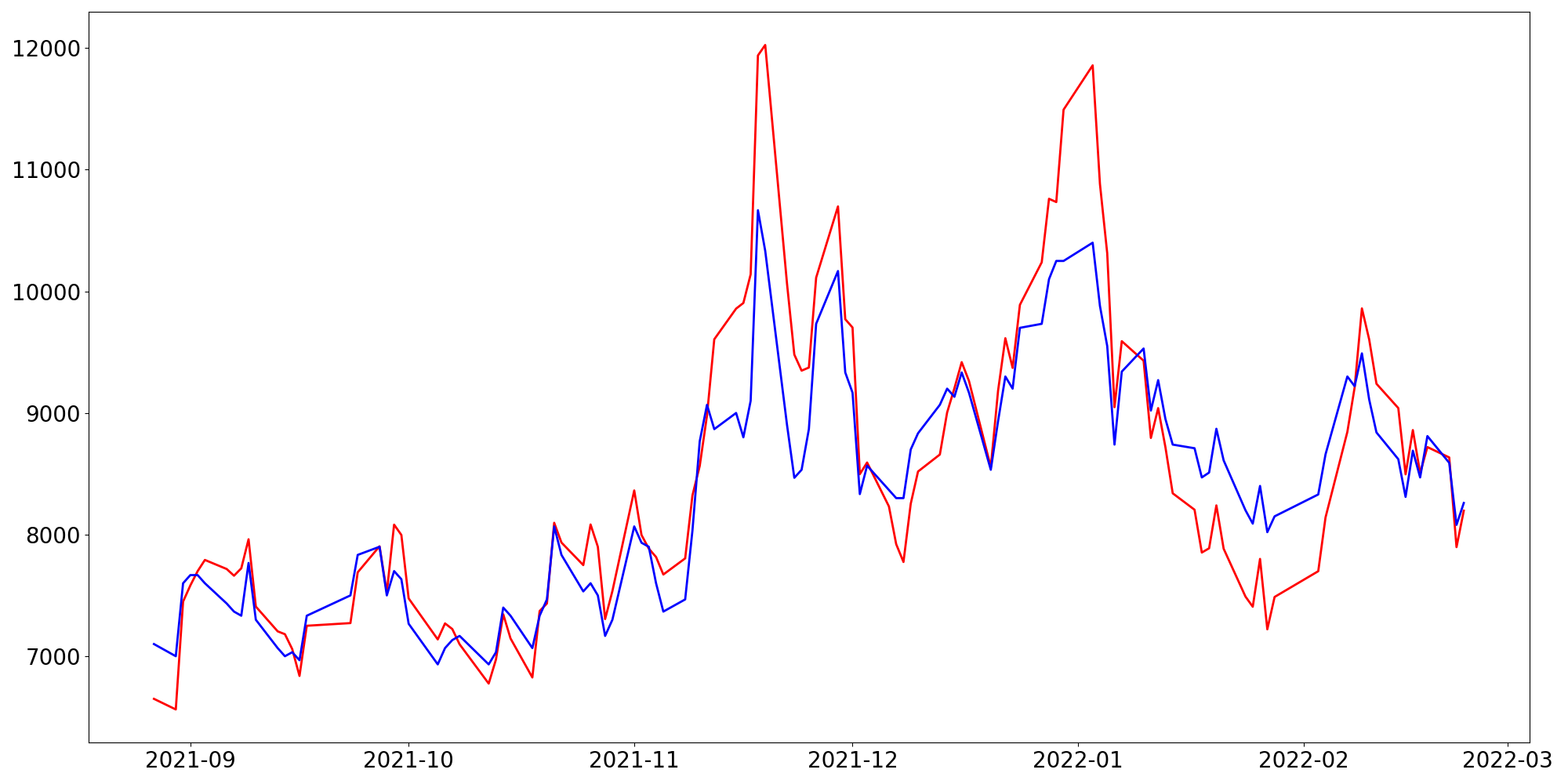 [ - : 실제값(종가) / - : 예측값(종가) ]