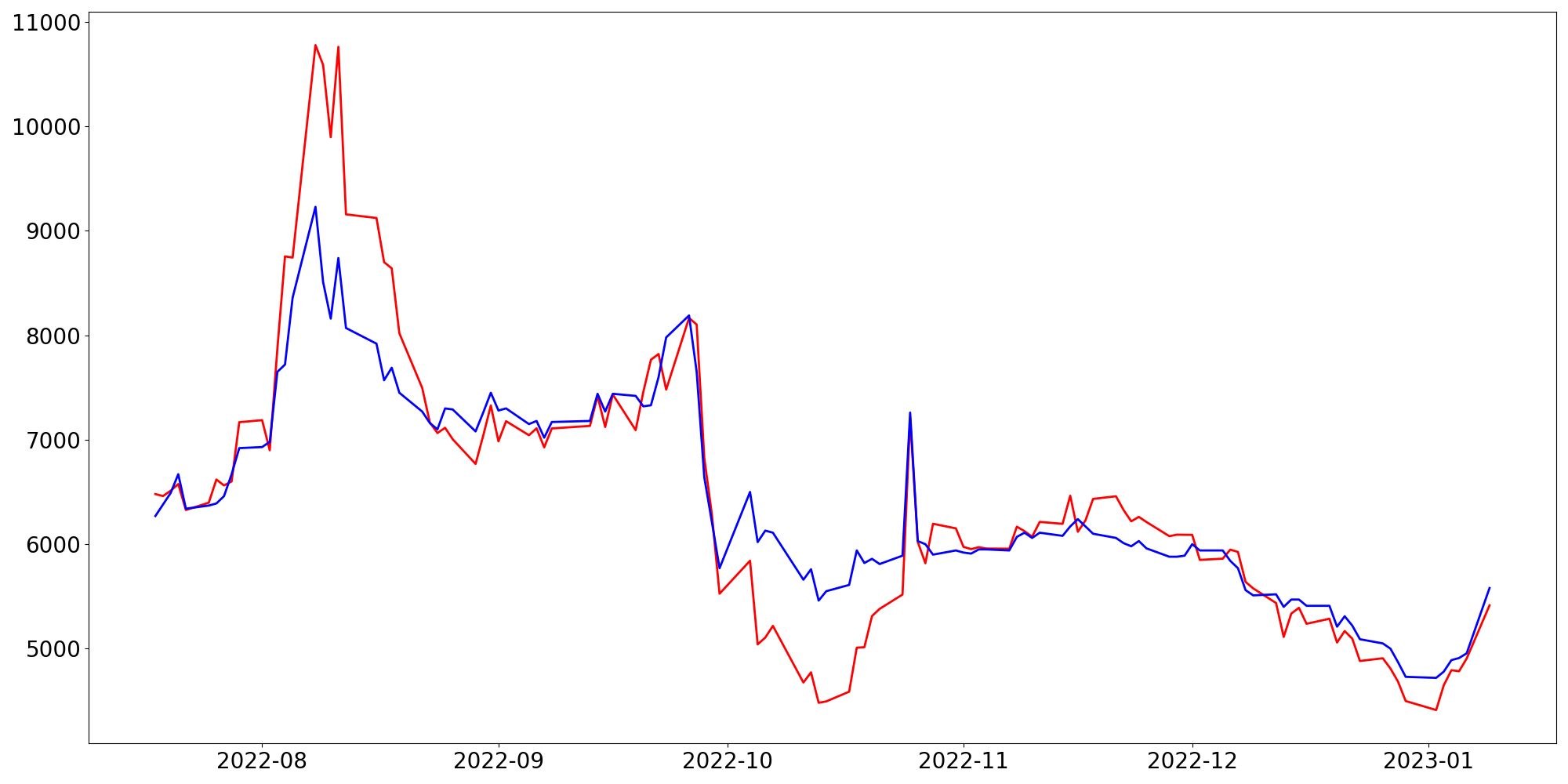 [ - : 실제값(종가) / - : 예측값(종가) ]