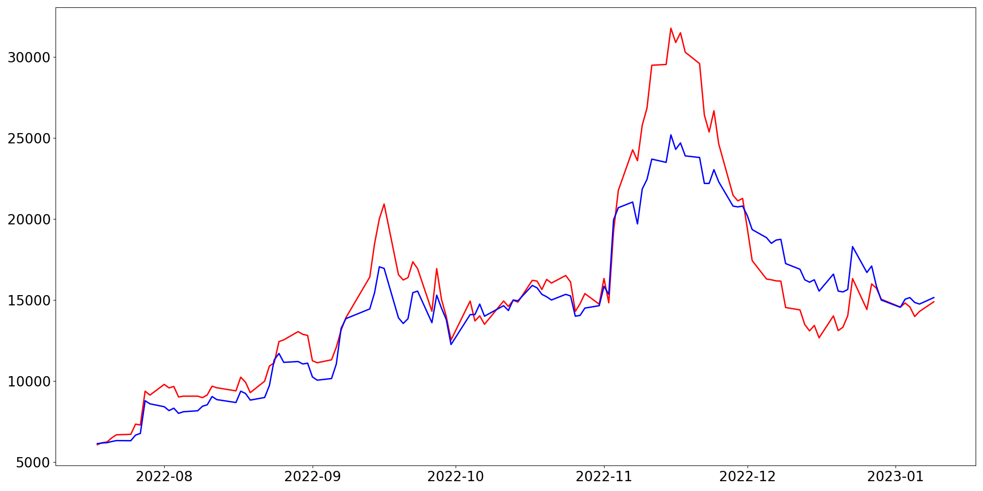 [ - : 실제값(종가) / - : 예측값(종가) ]