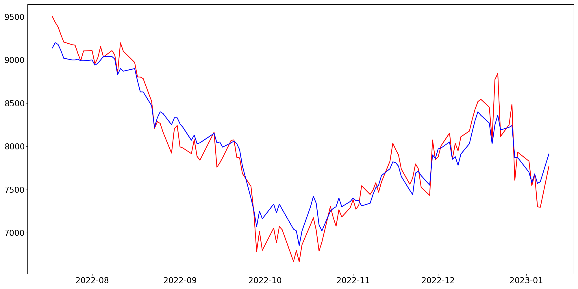 [ - : 실제값(종가) / - : 예측값(종가) ]