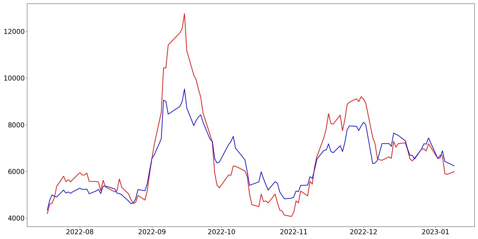[ - : 실제값(종가) / - : 예측값(종가) ]