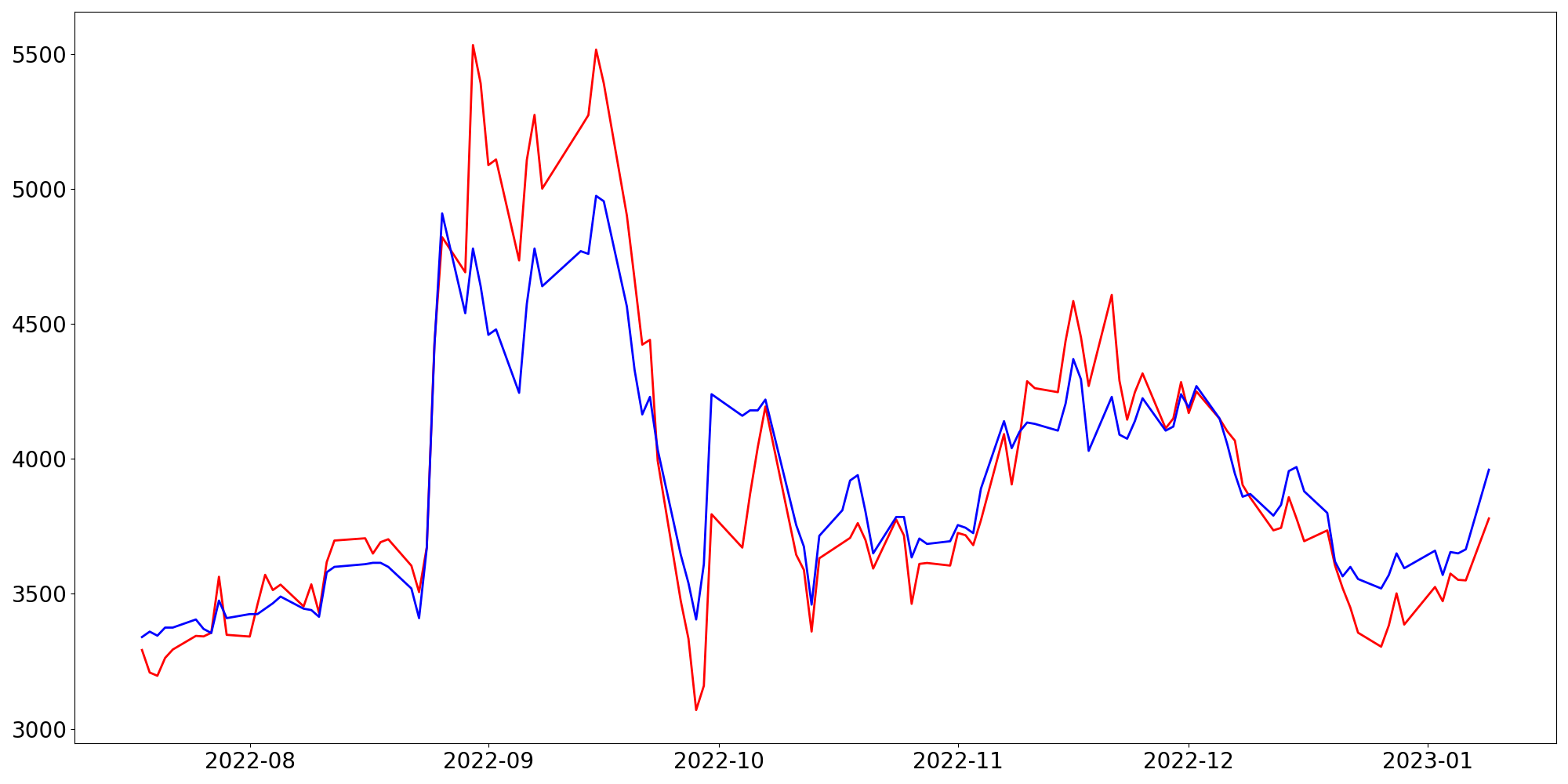 [ - : 실제값(종가) / - : 예측값(종가) ]
