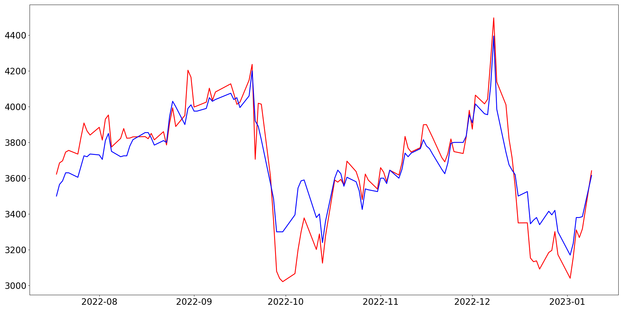 [ - : 실제값(종가) / - : 예측값(종가) ]