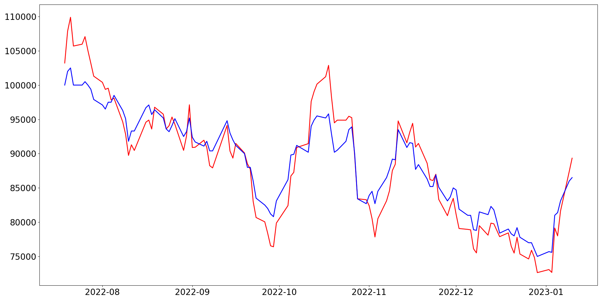 [ - : 실제값(종가) / - : 예측값(종가) ]