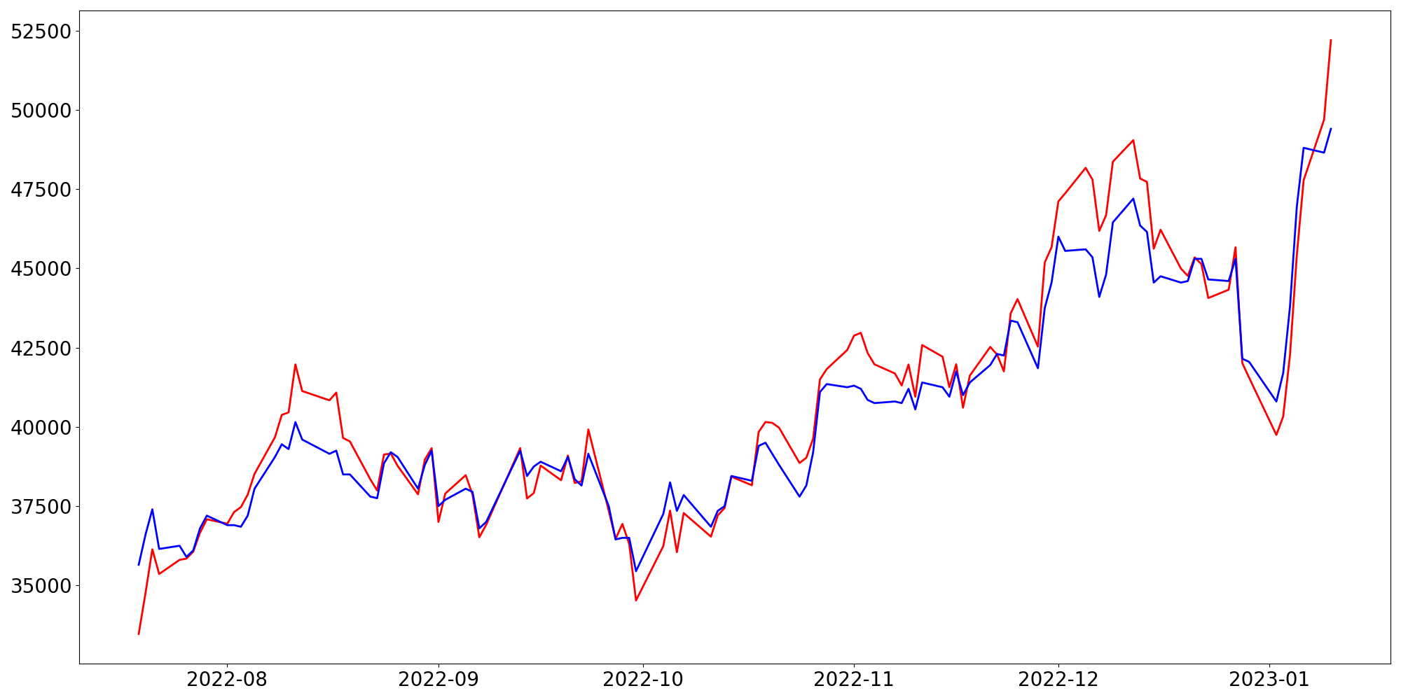 [ - : 실제값(종가) / - : 예측값(종가) ]