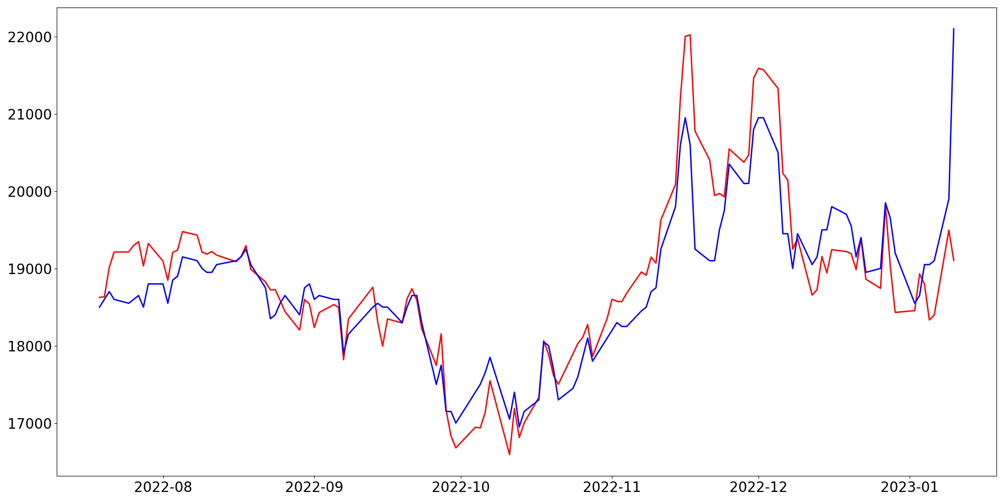 [ - : 실제값(종가) / - : 예측값(종가) ]
