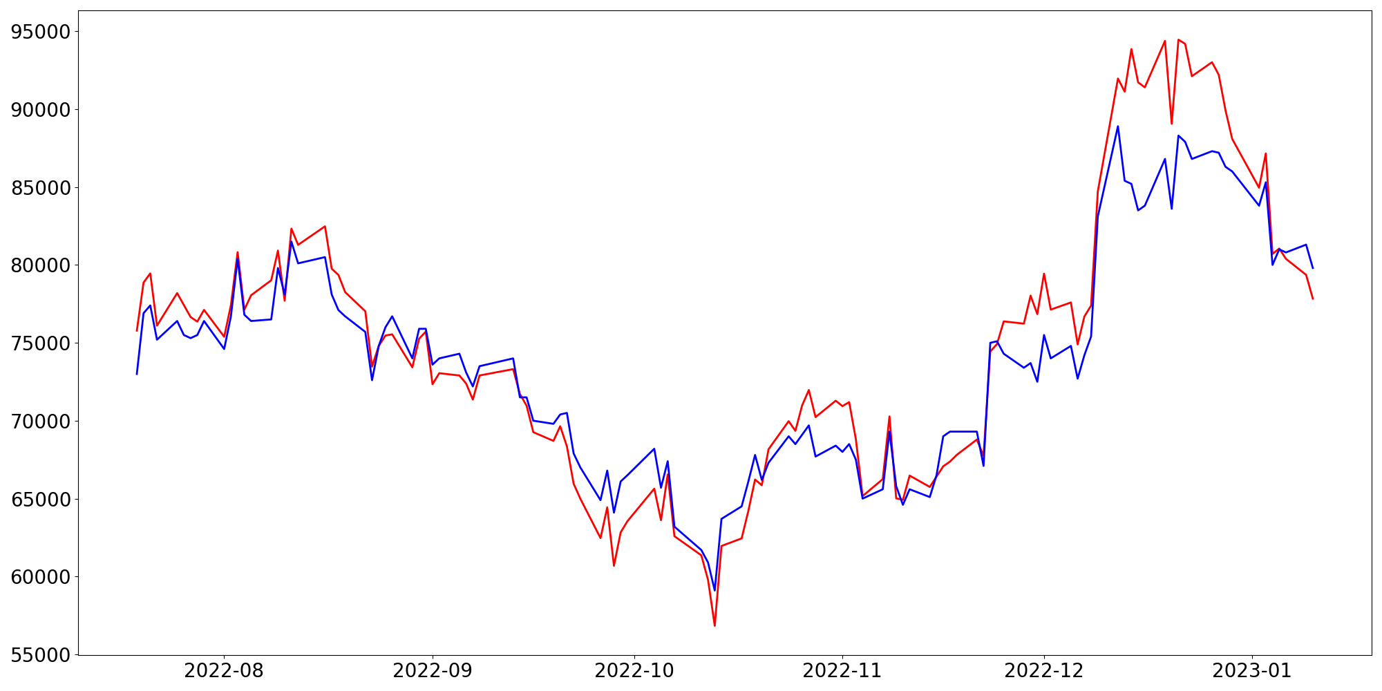 [ - : 실제값(종가) / - : 예측값(종가) ]