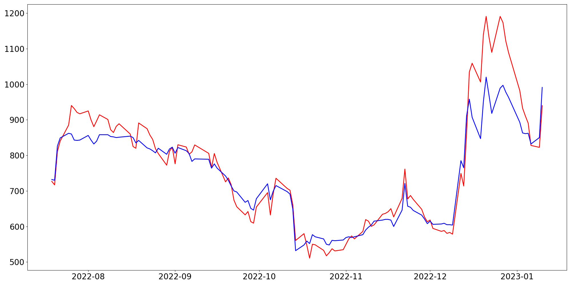 [ - : 실제값(종가) / - : 예측값(종가) ]
