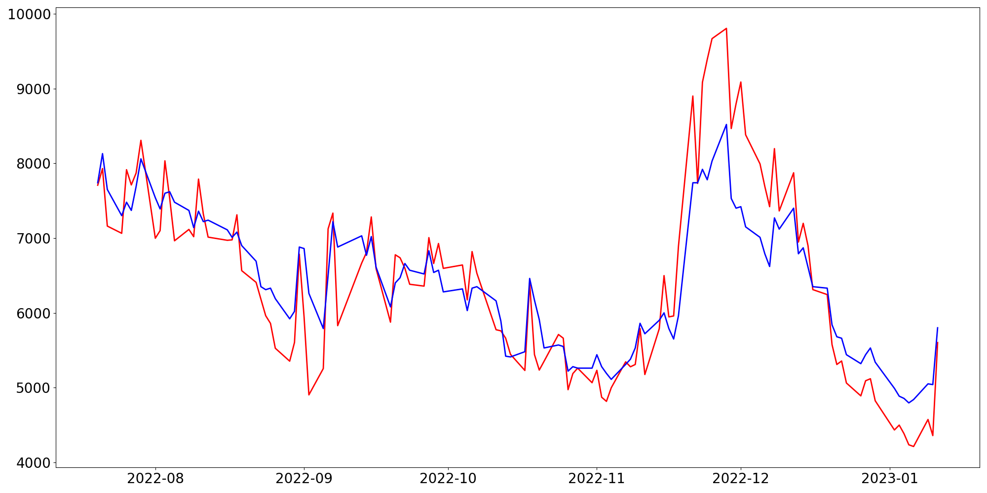 [ - : 실제값(종가) / - : 예측값(종가) ]