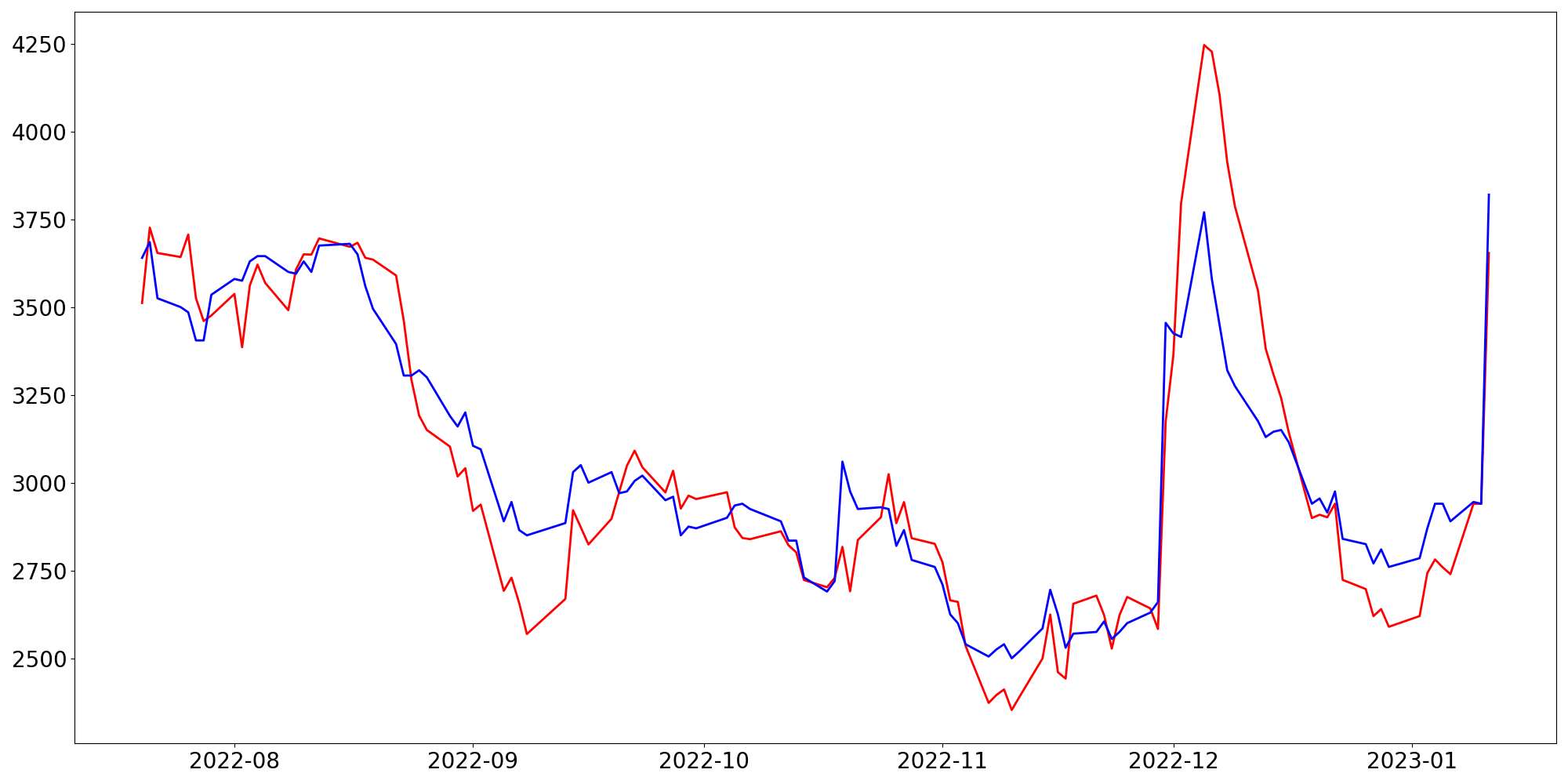 [ - : 실제값(종가) / - : 예측값(종가) ]