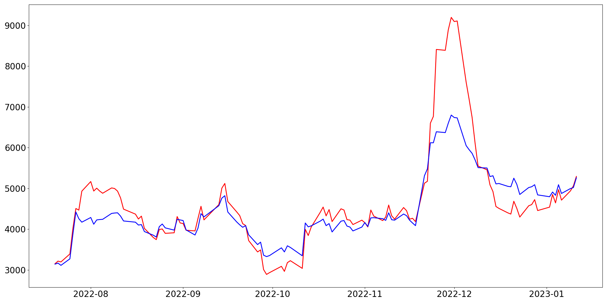 [ - : 실제값(종가) / - : 예측값(종가) ]