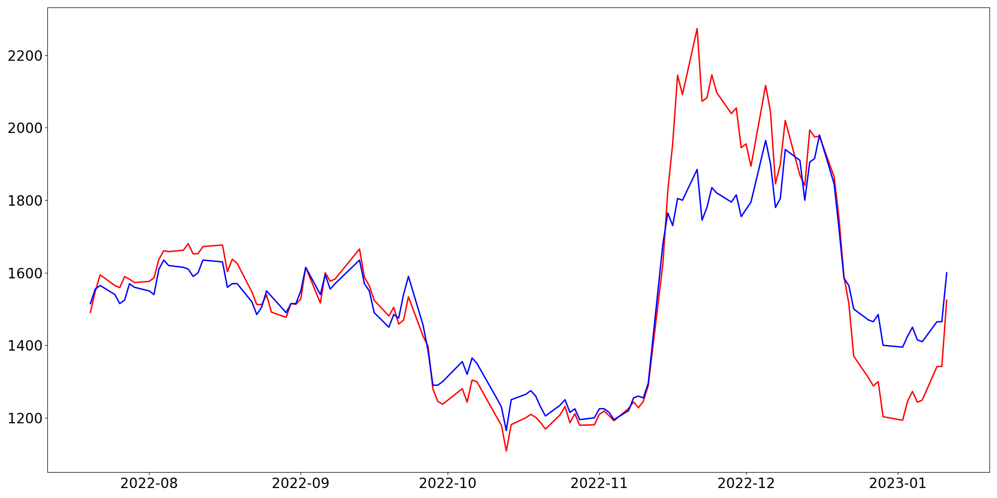[ - : 실제값(종가) / - : 예측값(종가) ]