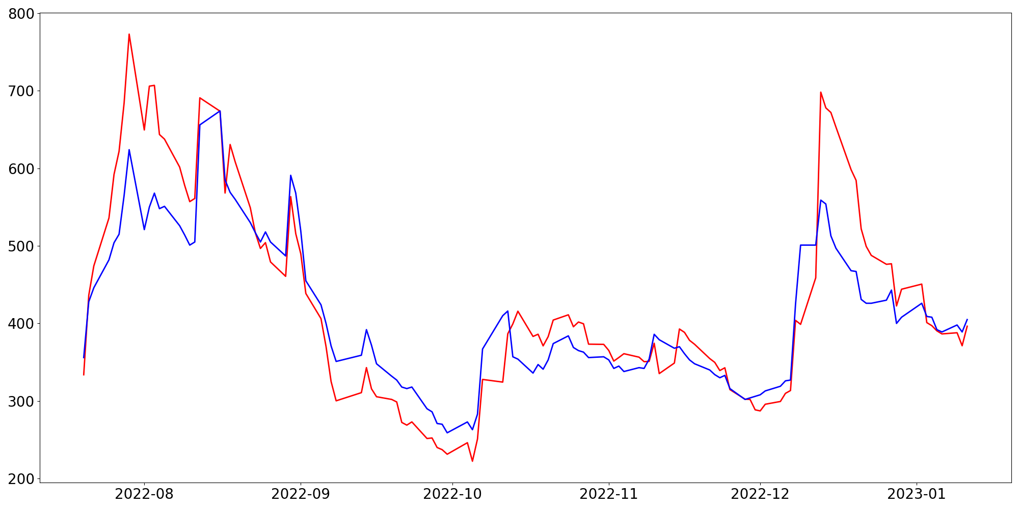 [ - : 실제값(종가) / - : 예측값(종가) ]