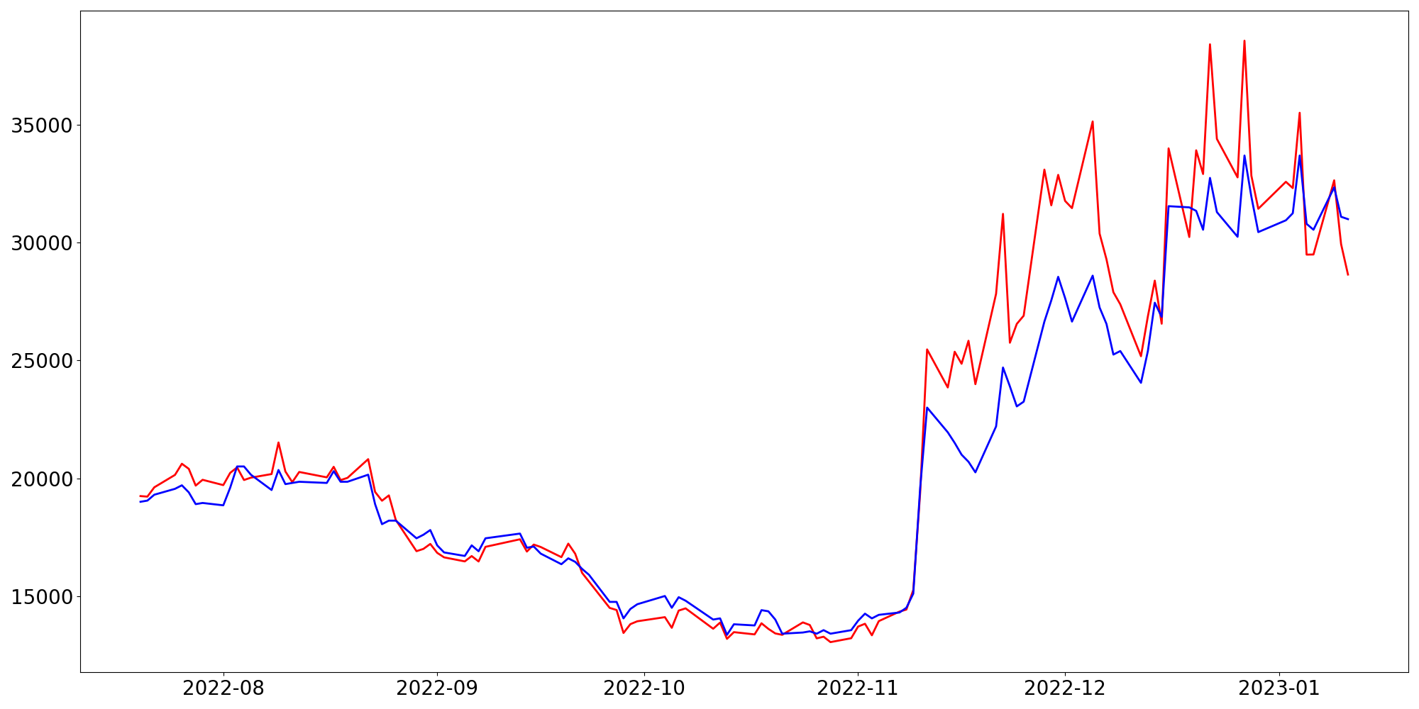 [ - : 실제값(종가) / - : 예측값(종가) ]
