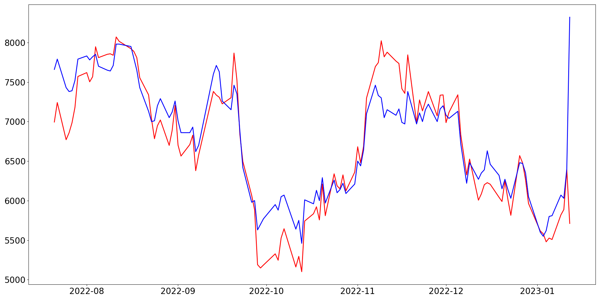 [ - : 실제값(종가) / - : 예측값(종가) ]