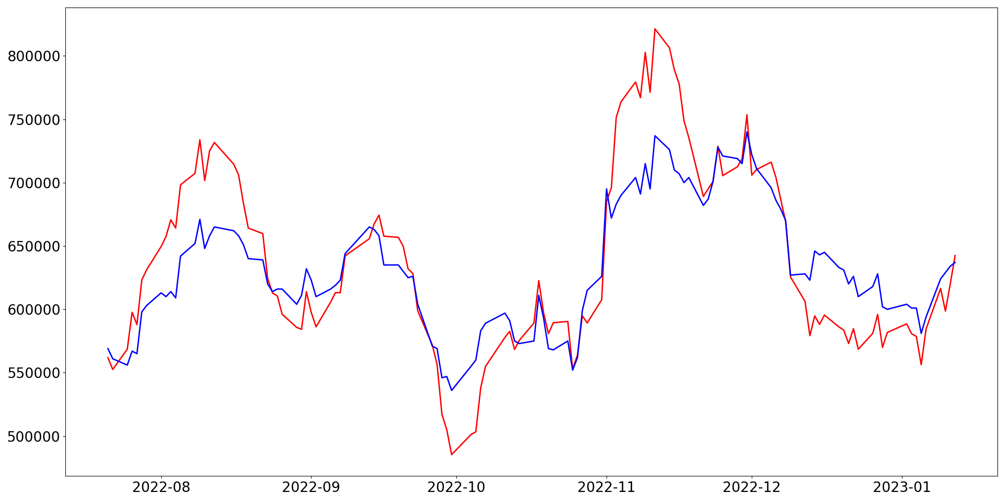 [ - : 실제값(종가) / - : 예측값(종가) ]