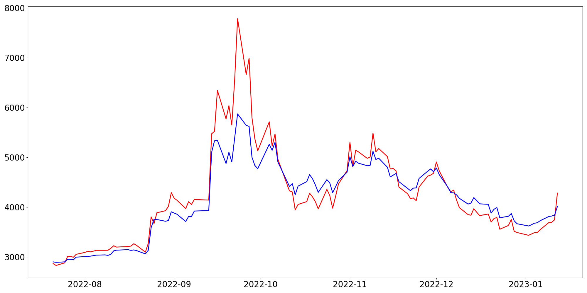 [ - : 실제값(종가) / - : 예측값(종가) ]