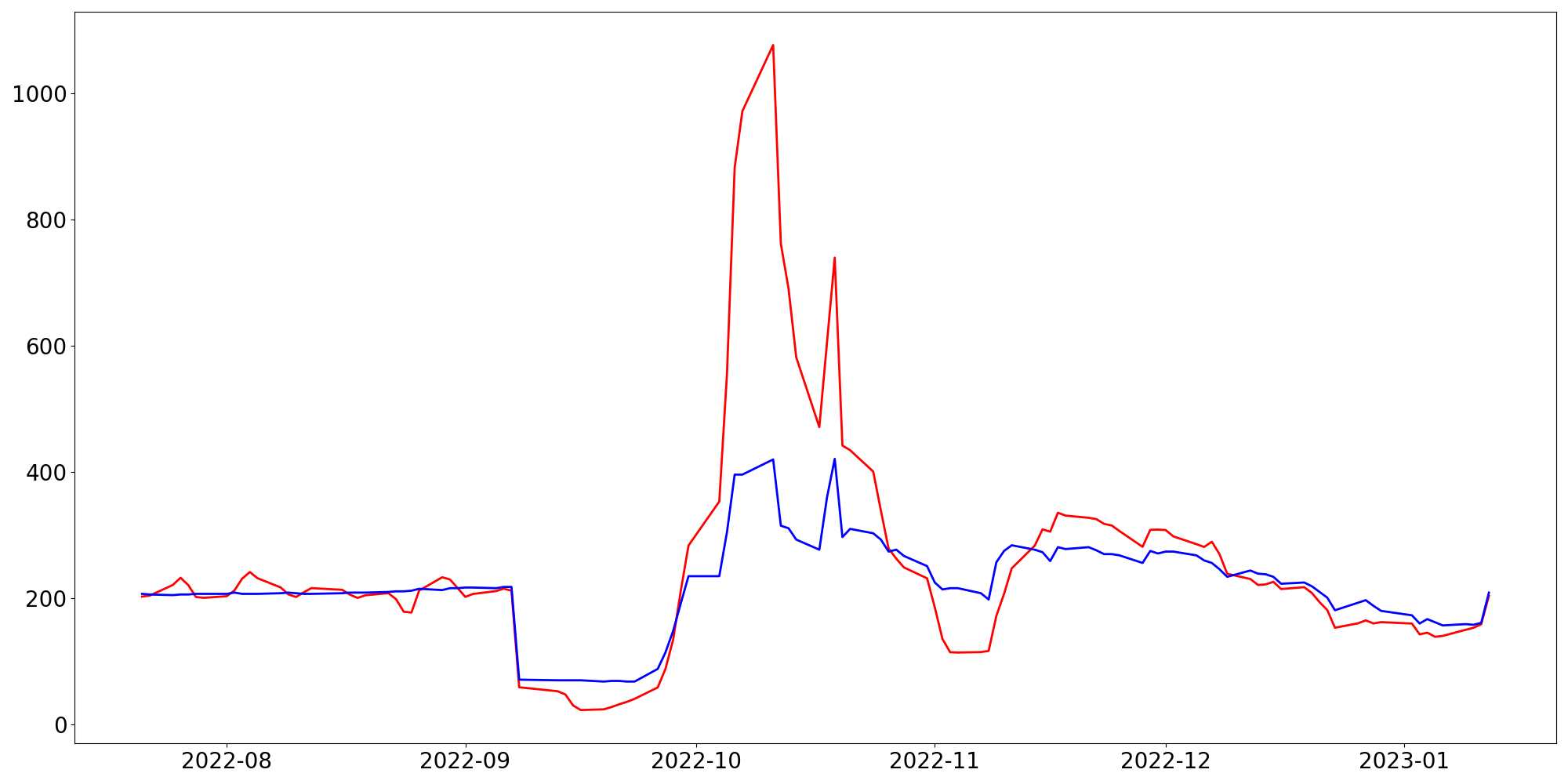 [ - : 실제값(종가) / - : 예측값(종가) ]