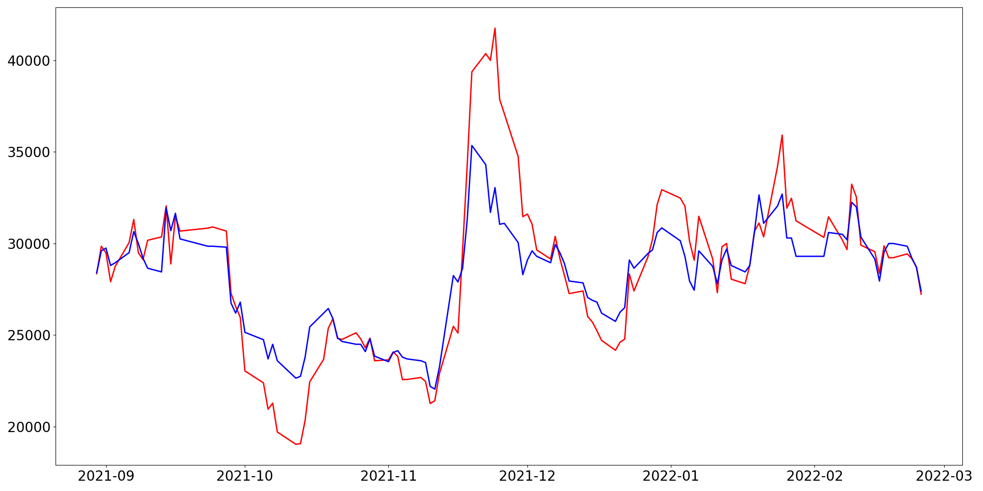 [ - : 실제값(종가) / - : 예측값(종가) ]