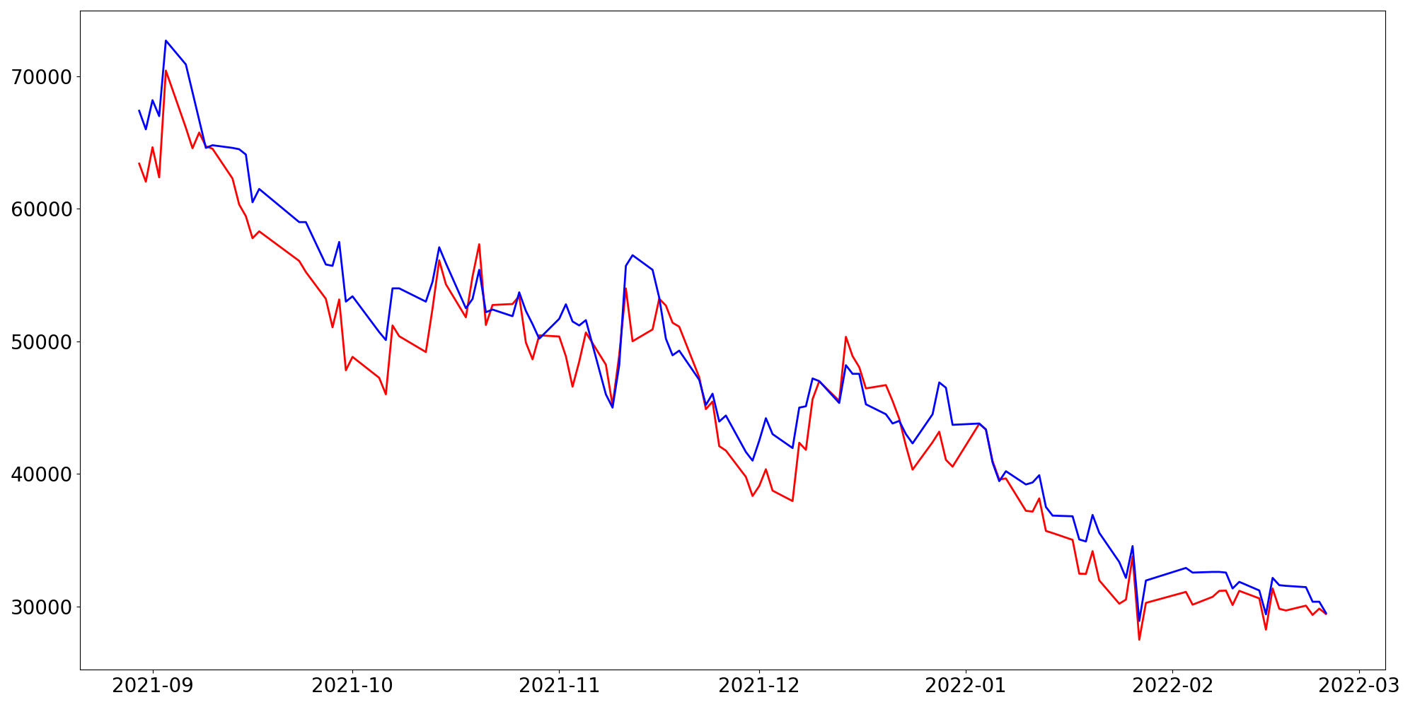 [ - : 실제값(종가) / - : 예측값(종가) ]