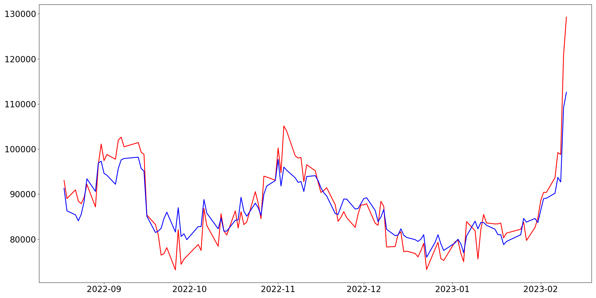 [ - : 실제값(종가) / - : 예측값(종가) ]