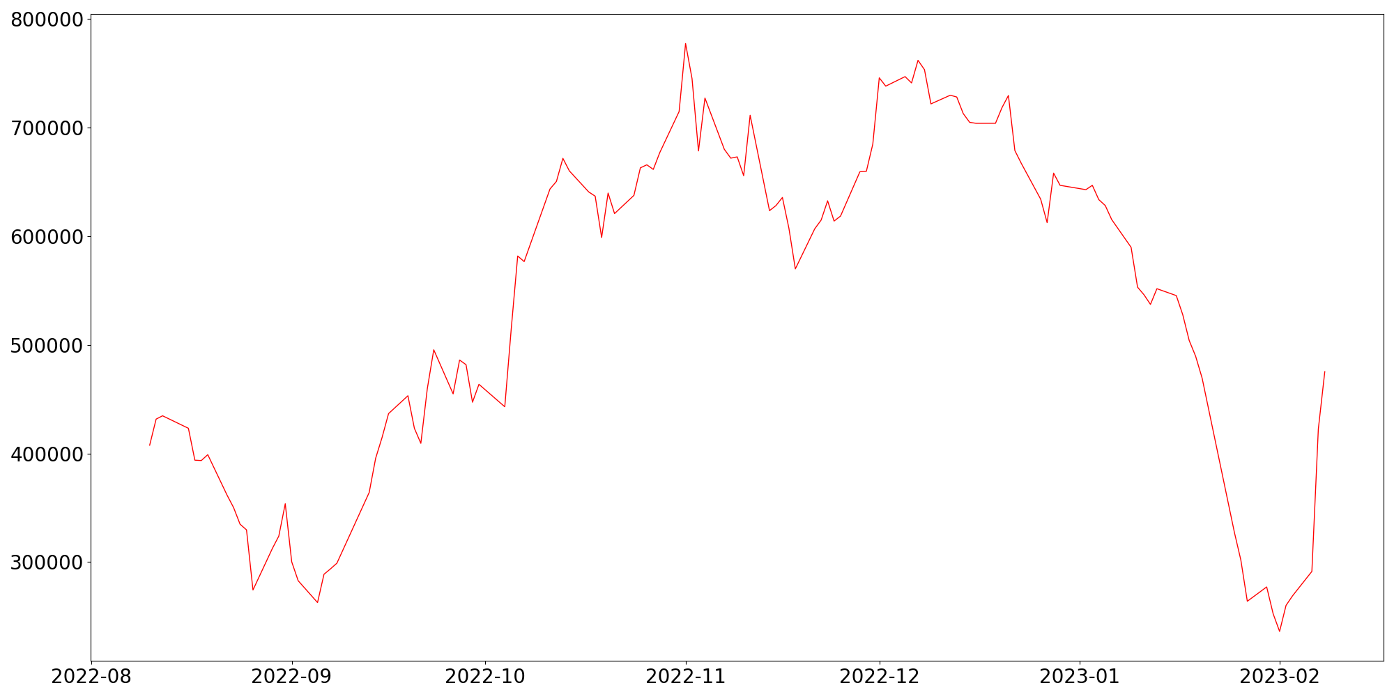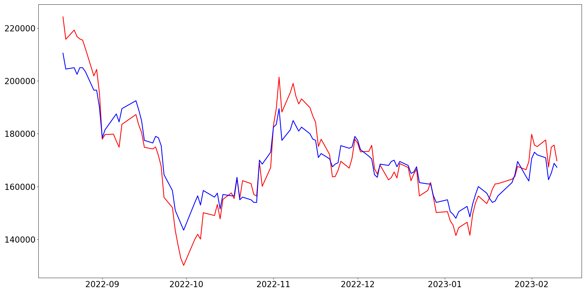 [ - : 실제값(종가) / - : 예측값(종가) ]