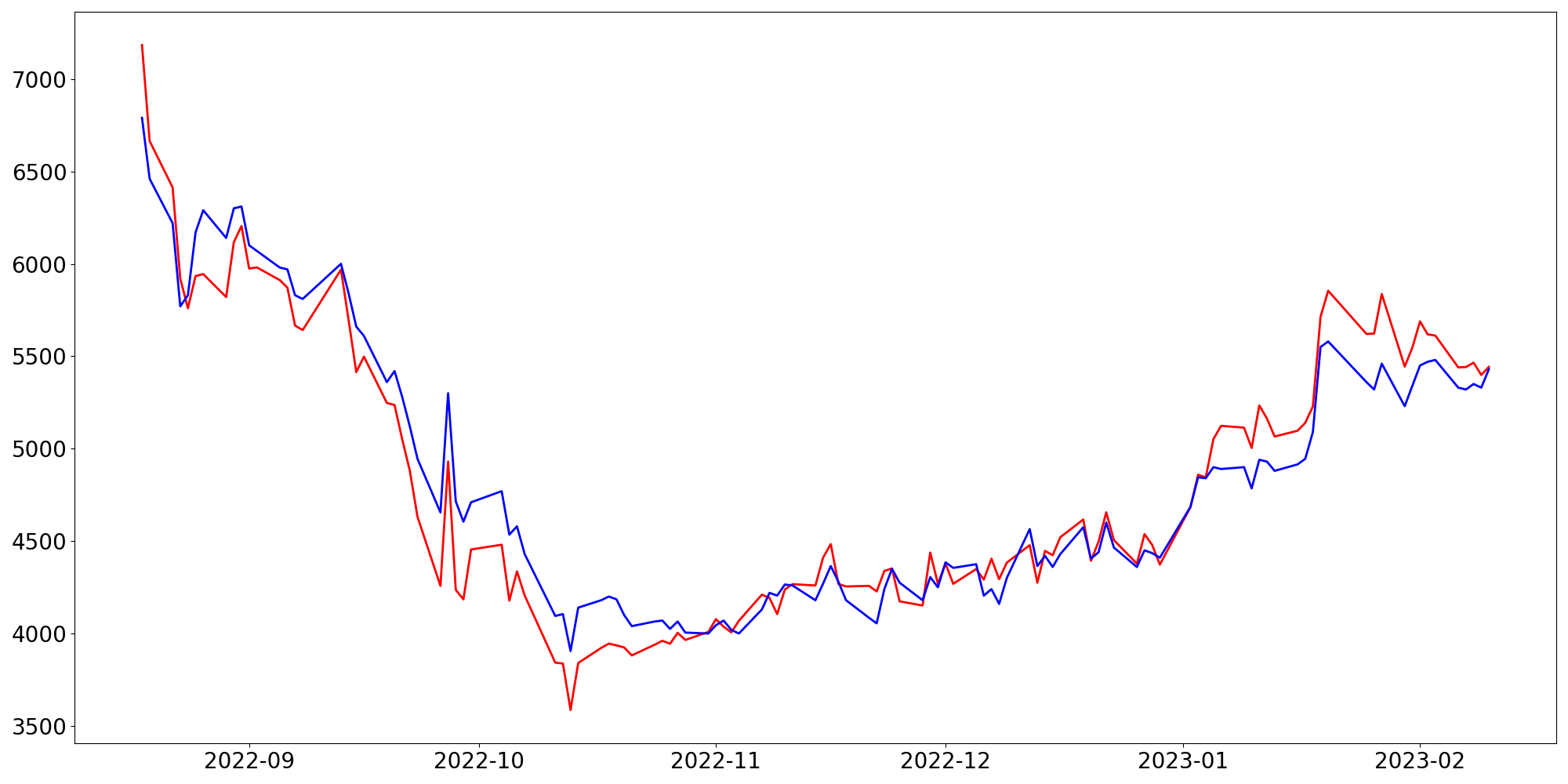 [ - : 실제값(종가) / - : 예측값(종가) ]